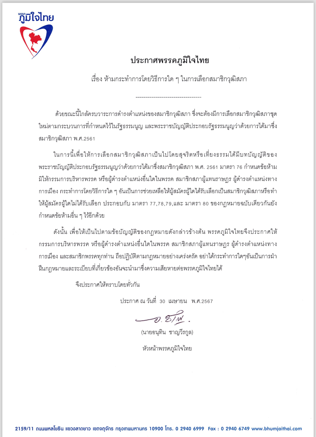 ดังนั้นเพื่อให้เป็นไปตามข้อบัญญัติของกฎหมายดังกล่าวข้างต้น พรรคภูมิใจไทยจึงประกาศให้กรรมการบริหารพรรค หรือผู้ดำรงตำแหน่งอื่นใดในพรรค สมาชิกสภาผู้แทนราษฎร ผู้ดำรงตำแหน่งทางการเมือง และสมาชิกพรรคทุกท่าน ถือปฏิบัติตามกฎหมายอย่างเคร่งครัด อย่าได้กระทำการใดๆ อันเป็นการฝ่าฝืนกฎหมาย และระเบียบที่เกี่ยวข้องอันจะนำมาซึ่งความเสียหายต่อพรรคภูมิใจไทยได้