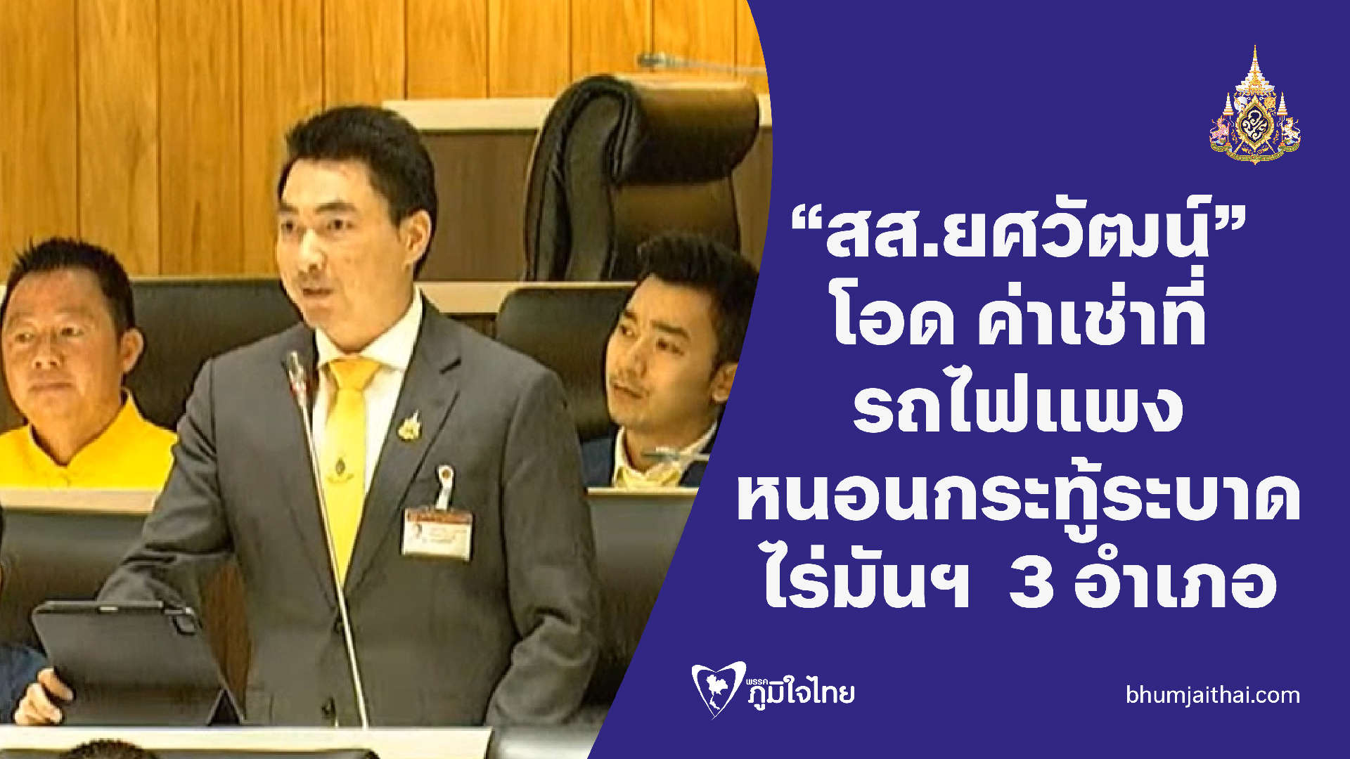 วันที่ 3 กรกฎาคม 2567 นายยศวัฒน์ มาไพศาลสิน สส.กาญจนบุรี เขต 3 พรรคภูมิใจไทย หารือประธานสภาฯ ขอให้การรถไฟแห่งประเทศไทย เร่งแก้ปัญหาค่าเช่าที่รถไฟแพงจากปีละพัน เป็นปีละหมื่นบาท และ ก.เกษตรฯ ให้เข้าไปแก้หนอนกระทู้หอมระบาดในพื้นที่ 3 อำเภอ ในจังหวัดกาญจนบุรี โดยนายยศวัฒน์ กล่าวว่า ขอร้องเรียน การรถไฟแห่งประเทศไทย รวมไปถึงกระทรวงเกษตรและสหกรณ์ เรื่องการเช่าที่การรถไฟแห่งประเทศไทยในพื้นที่จังหวัดกาญจนบุรีสืบเนื่องมาจาก ได้รับการร้องเรียนจากได้รับการร้องเรียนจากนางสาวปุุณยวีร์ โพธิพิพิธ นายกเทศมนตรีเมืองท่าเรือพระแท่นว่า พ่อแม่พี่น้องประชาชนที่อาศัยอยู่ในเขตของการรถไฟที่เช่าประมาณ 50 ปี ได้รับการร้องเรียนว่าตอนนี้ในส่วนของการรถไฟมีการปรับเปลี่ยนค่าเช่า ซึ่งทําให้พ่อแม่พี่น้องนั้นไม่มีเงินเพียงพอกับอัตราใหม่ที่การรถไฟแห่งประเทศไทยนําเสนอมา ในอดีตที่ผ่านมาการเช่านั้นเพียงหลักพัน แต่วันนี้ค่าเช่าหลักหมื่นต่อปี และมีการปรับย้อนหลังเป็นแสนบาทต่อราย