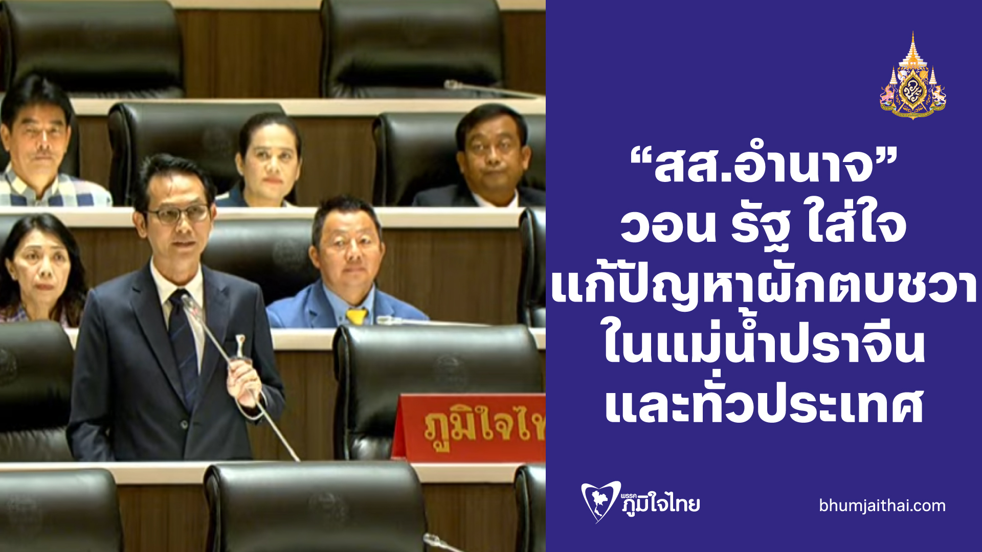 นายอำนาจ วิลาวัลย์ สมาชิกสภาผู้แทนราษฎร จังหวัดปราจีนบุรี พรรคภูมิใจไทย ได้หารือประธานรัฐสภา ว่า ให้รัฐบาลช่วยแก้ปัญหาที่เกิดขึ้นในแม่น้ำปราจีนบุรีแม่น้ําสายหลักที่หล่อเลี้ยงพี่น้องจังหวัดจังหวัดปราจีนบุรีและจังหวัดฉะเชิงเทรา ในแม่น้ำปราจีนบุรีเต็มไปด้วยผักตบชวาที่ไหลล้นทะลักลักมาจากคลองต่างๆลงสู่แม่น้ําระยะทางหลาย 10 กิโลเมตรถึงเวลาหรือยังที่ทางรัฐบาลจะให้ความจริงจังในความสำคัญในการแก้ไขปัญหาและการกําจัดระบบนี้ ถึงเวลาที่จะต้องแก้ไขปัญหานี้อย่างจริงจัง มีหน่วยงานที่รับผิดชอบเรื่องของผักตบชวาอยู่หลายหน่วยงานมีทั้งกรมชลประทาน มีกรมโยธาธิการและผังเมือง กรมเจ้าท่า สำนักงานทรัพยากรน้ำแห่งชาติ(สทนช.) และมีงบประมาณมากมายแต่ไม่สามารถแก้ปัญหาเรื่องผักตบชวาได้อย่างเป็นรูปธรรม
