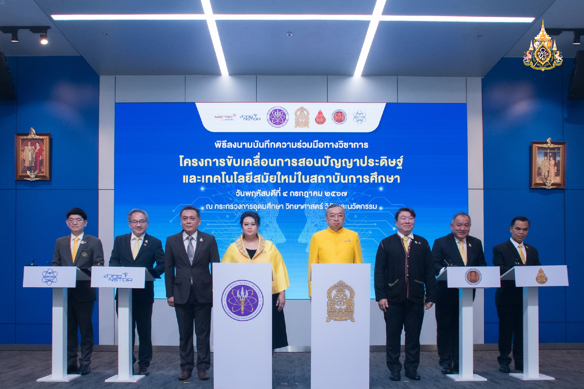 (วันที่ 4 กรกฎาคม 2567) ห้องแถลงข่าวชั้น 1 อาคารพระจอมเกล้า กระทรวงการอุดมศึกษา วิทยาศาสตร์ วิจัยและนวัตกรรม (อว.): กระทรวงการอุดมศึกษา วิทยาศาสตร์ วิจัยและนวัตกรรม โดย สำนักงานพัฒนาวิทยาศาสตร์และเทคโนโลยีแห่งชาติ (สวทช.) ร่วมกับ กระทรวงศึกษาธิการ โดย สำนักงานคณะกรรมการการศึกษาขั้นพื้นฐาน (สพฐ.) สำนักงานคณะกรรมการการอาชีวศึกษา (สอศ.) และสถาบันส่งเสริมการสอนวิทยาศาสตร์และเทคโนโลยี (สสวท.) ลงนามบันทึกความร่วมมือทางวิชาการ “โครงการขับเคลื่อนการสอนปัญญาประดิษฐ์และเทคโนโลยีสมัยใหม่ในสถาบัน การศึกษา” เพื่อสร้างผู้สอน นักเรียนทุกคน ทุกช่วงชั้น ให้มีความรู้ด้าน AI มีความเข้าใจและตระหนัก เรื่องจริยธรรมของการนำไปใช้ประโยชน์ (ethical considerations) เพื่อเตรียมพร้อมสู่การเป็นพลเมืองดิจิทัล และรองรับตลาดแรงงานสมัยใหม่แห่งศตวรรษที่ 21 โอกาสนี้ พลตำรวจเอกเพิ่มพูน ชิดชอบ รัฐมนตรีว่าการกระทรวงศึกษาธิการ (ศธ.) และ นางสาวศุภมาส อิศรภักดี รัฐมนตรีว่าการกระทรวงการอุดมศึกษา วิทยาศาสตร์ วิจัยและนวัตกรรม (อว.) ได้กล่าวแสดงความยินดีและมอบนโยบายที่เกี่ยวข้อง