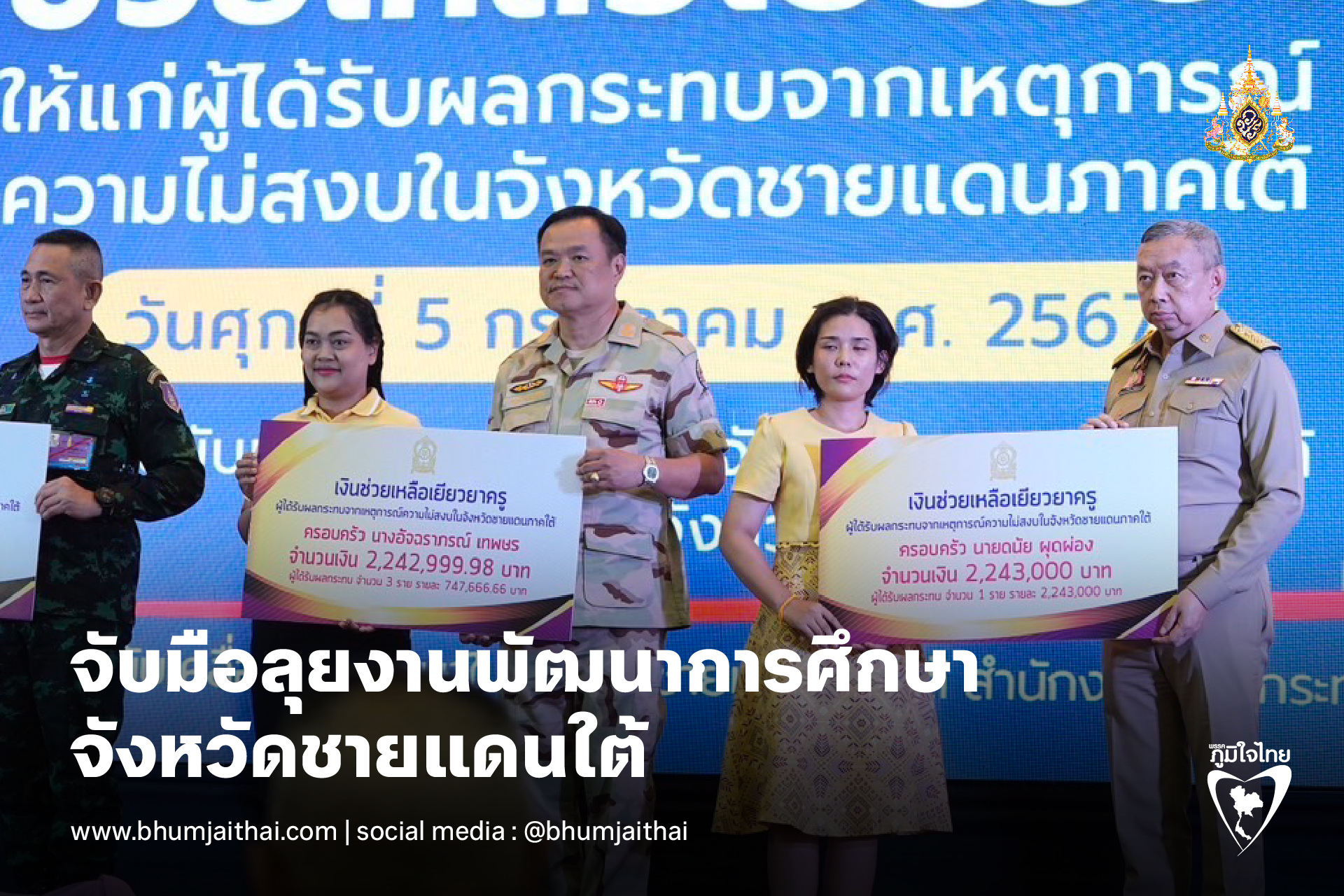 มหาดไทย ศึกษา กองทัพบก จับมือลุยงานพัฒนาการศึกษาจังหวัดชายแดนใต้ มุ่งพัฒนาคนสร้างสันติสุข ยกระดับคุณภาพชีวิตยั่งยืน พร้อมมอบเงินเยียวยาครูเสียชีวิตจากเหตุความรุนแรง 48 ครอบครัวเป็นเงิน 129.10 ล้านบาท
