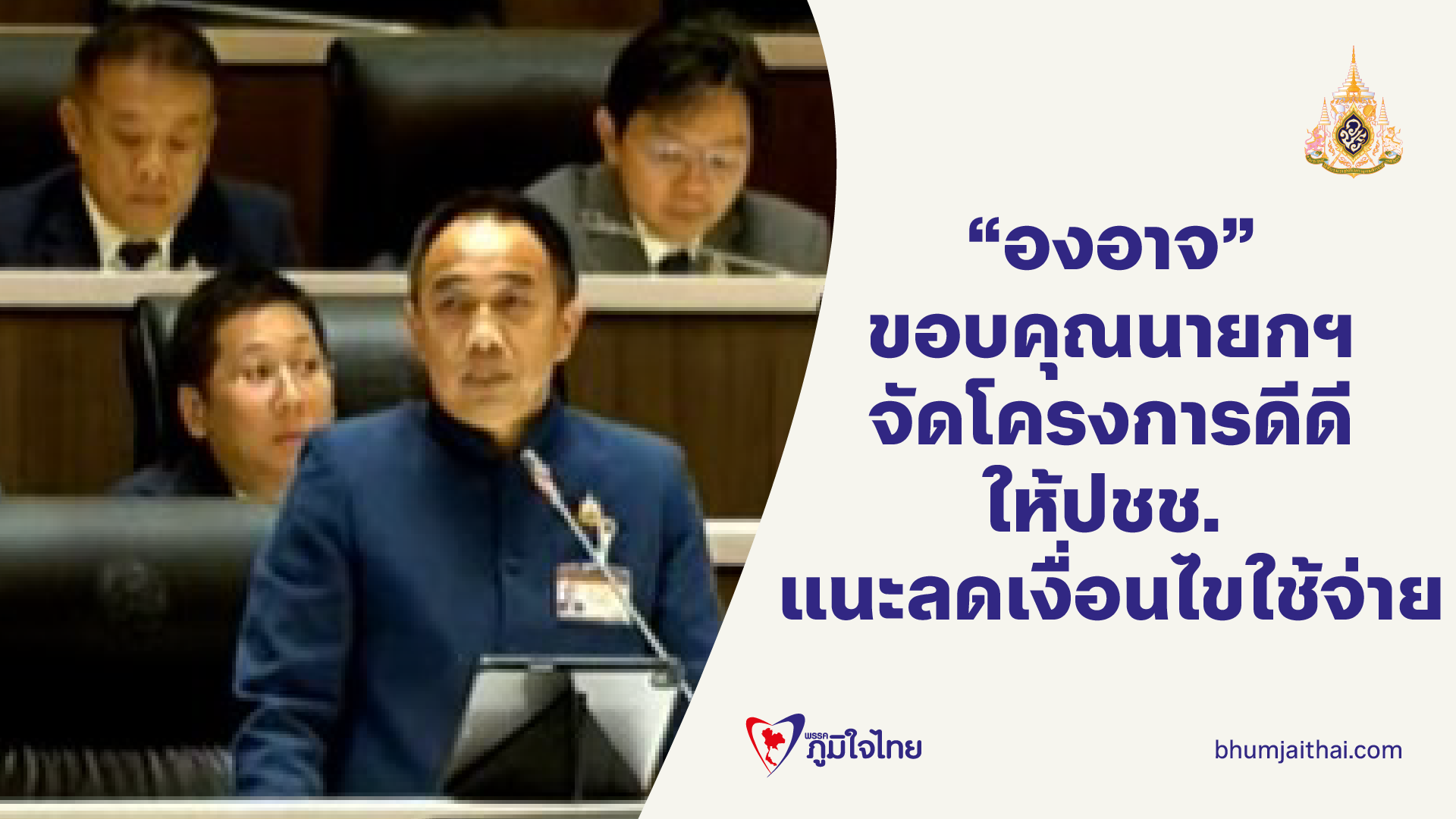 "ที่แบกมาถามท่านประธานผ่านไปถึงท่านนายก ก็แค่อยากขอบคุณสําหรับความหวังดีที่ท่านนายกฯ มีให้กับพี่น้องประชาชน ขอบคุณที่กําลังจะสร้างฝันที่พี่น้องประชาชนรอคอยให้บรรลุความฝันที่เขารอคอยมานานแสนนาน และที่สําคัญก็คือ ไม่อยากที่จะให้โครงการที่มีความหวังดีจากรัฐบาล เป็นความรักที่มีเงื่อนไข ความห่วงใยมีข้อจํากัด อยากที่จะให้ขยายกรอบความเข้าใจ ขยายกรอบการใช้ให้เกิดประโยชน์บรรลุวัตถุประสงค์ให้เต็มกําลังความสามารถของแต่ละคน อยากให้เขามีสิทธิ์ที่จะใช้ มีสิทธิ์ที่จะคิดในสิ่งที่เขาควรจะคิดในสิ่งที่เขาควรจะได้ สุดท้ายขออนุญาตขอบคุณไปถึงท่านนายกรัฐมนตรีที่จัดโครงการดีๆ แบบนี้" นายองอาจ กล่าว