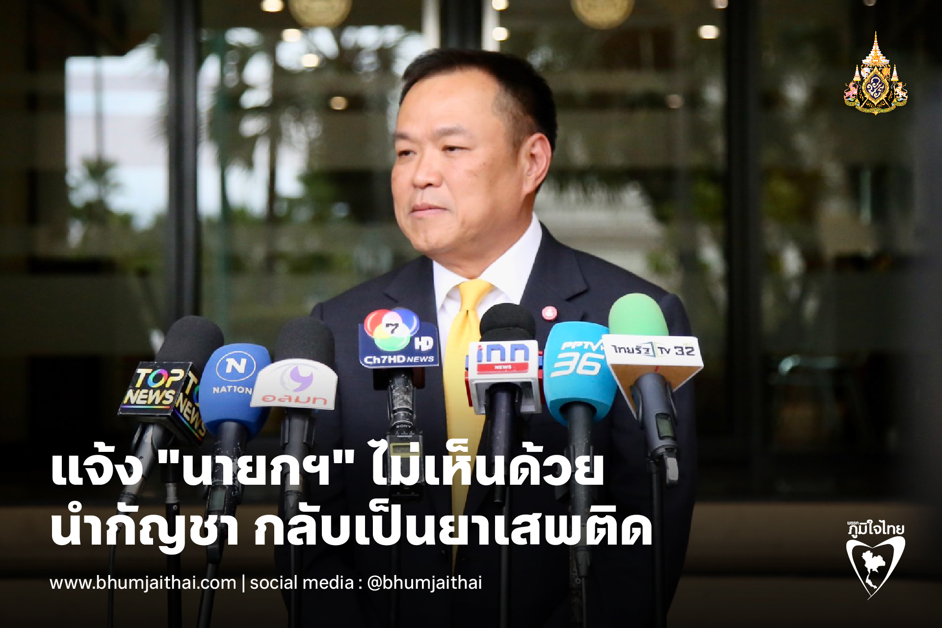 " ประเด็นกัญชาไม่เกี่ยวกับพรรคร่วมรัฐบาล อย่าไปเชื่อมโยงกันเป็นเรื่องของคนทำงาน เคยอยู่กระทรวงสาธารณสุขมาก่อน ข้อมูลการนำกัญชาออกจากยาเสพติดก็มาจากกระทรวงสาธารณสุข ซึ่งมีคณะกรรมการที่มีปลัดกระทรวงสาธารณสุขเป็นประธาน ที่เห็นชอบกัญชากลับไปเป็นยาเสพติด แต่เมื่อมีการเปลี่ยนแปลงตัวผู้บริหารระดับสูงของกระทรวงท่านใหม่เข้าไป ทำไมจึงไม่นำข้อมูลเดิมให้รัฐมนตรีท่านใหม่ทราบ ซึ่งตนก็เห็นว่าข้อมูลยังไม่พอ แต่ถ้าข้อมูลใหม่เข้ามาสังคมถูกทำลายโดยกัญชาเต็มบ้านเต็มเมือง หรือกัญชาไม่มีประโยชน์ใดๆเลย ไม่มีสรรพคุณทางยา มโนทั้งนั้นรักษาใครไม่ได้ ถ้าข้อมูลเป็นแบบนี้เราก็ต้องยอมให้นำกลับไปเป็นยาเสพติด"