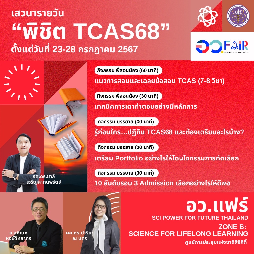 เมื่อวันที่ 20 ก.ค. 2567 น.ส.ศุภมาส อิศรภักดี รมว.การอุดมศึกษา วิทยาศาสตร์ วิจัยและนวัตกรรม(อว.) เปิดเผยว่า ในงาน อว.แฟร์ที่จัดขึ้นระหว่างวันที่ 23 – 28 ก.ค.2567 ไฮไลท์สำคัญของงานจะมีการจัดกิจกรรมเสวนารายวัน “พิชิต TCAS68” ที่ TCAS Station โซน B: Science for Lifelong Learning ศูนย์ประชุมแห่งชาติสิริกิติ์ จะมีกิจกรรมพี่สอนน้องแนวการสอบและเฉลยข้อสอบ TCAS(7 – 8 วิชา) เทคนิคการเดาคำตอบอย่างมีหลักการ กิจกรรมบรรยาย “รู้ก่อนใคร...ปฎิทิน TCAS68 และต้องเตรียมอะไรบ้าง?” กิจกรรมเตรียม Portfolio อย่างไรให้โดนใจกรรมการคัดเลือก กิจกรรมบรรยาย “10 อันดับรอบ 3 Admission เลือกอย่างไรให้ดีพอ”