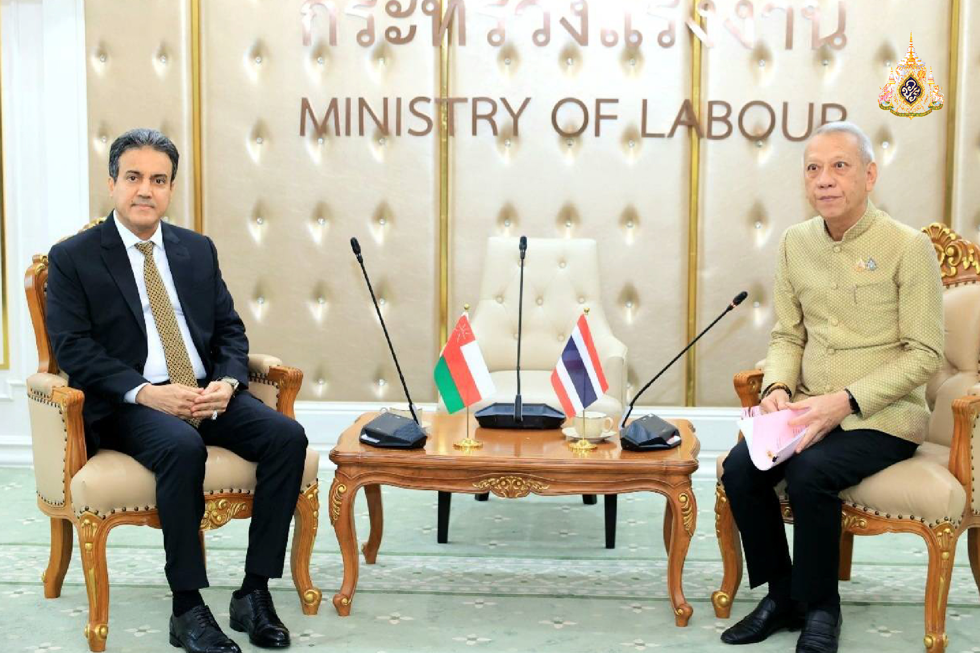 ด้าน นายอิสซา อับดุลเลาะฮ์ ญาบิร อัลอาลาวี (Mr. Issa Abdullah Jaber Al-Alawi) เอกอัครราชทูตวิสามัญผู้มีอำนาจเต็มแห่งรัฐสุลต่านโอมานประจำประเทศไทย กล่าวว่า ผมขอขอบคุณท่านรัฐมนตรีว่าการกระทรวงแรงงานและคณะ ที่เปิดโอกาสให้เข้าพบเพื่อหารือความร่วมมือด้านแรงงานกันในวันนี้ ประเทศโอมานพร้อมให้ความช่วยเหลือ ดำเนินการ และประสานงานเกี่ยวกับกิจการด้านแรงงานระหว่างกัน พร้อมทั้ง ผมยินดีจัดทำ MOU ในการพัฒนาทักษะฝีมือแรงงานร่วมกันได้ และหวังเป็นอย่างยิ่งว่า ความร่วมมือด้านแรงงานของเราจะได้เกิดขึ้นอย่างเป็นทางการในอนาคตอันใกล้นี้และพัฒนาต่อไปอย่างแน่นแฟ้นยิ่งขึ้นต่อไป