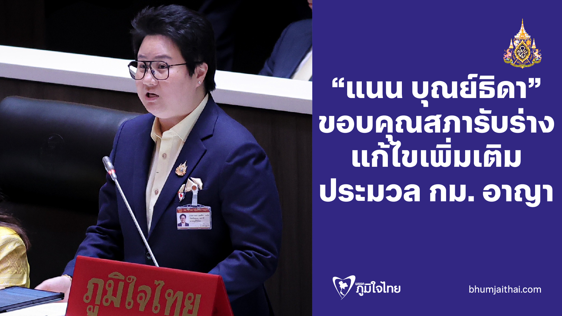 นางสาวแนน บุณย์ธิดา สมชัย สมาชิกสภาผู้แทนราษฎรจังหวัดอุบลราชธานี พรรคภูมิใจไทย อภิปรายร่างพระราชบัญญัติแก้ไขเพิ่มเติมประมวลกฎหมายอาญา (ฉบับที่...)พ.ศ....ที่ได้รับมอบหมายจาก นายอนุทิน ชาญวีรกูล หัวหน้าพรรคภูมิใจไทย กับคณะเป็นผู้เสนอ ว่า ด้วยหลักการและเหตุผลของร่างพระราชบัญญัตินี้ เป็นการแก้ไขเพิ่มเติมประมวลกฎหมายอาญา จะมีหลักการ 3 ประเด็นคือ 1.แก้ไขเพิ่มเติมบทนิยามคําว่า "กระทําชําเรา" 2. เป็นการยกเลิกเหตุฉกรรจ์ความผิดฐานอนาจาร และ3.เป็นการกําหนดความผิดฐาน "คุกคามทางเพศ" ซึ่งจะเป็นการแก้ไขเพิ่มเติมมาตราและเพิ่มมาตรา รวมทั้งยกเลิกในถ้อยคํา ซึ่งจะเป็นรายละเอียดในชั้นของกรรมาธิการต่อไป ส่วนเหตุผลในการเสนอร่างพระราชบัญญัติฉบับนี้ เนื่องจากปัจจุบันกฎหมายอาญาไทยยังไม่ครอบคลุมความผิดทางเพศในรูปแบบที่หลากหลาย ปัญหาการคุกคามทางเพศมีแนวโน้มเพิ่มขึ้นรวดเร็วและรุนแรงขึ้น ทางกฎหมายมีฐานความผิดเพียงก่อความเดือดร้อนรําคาญ เป็นความผิดลหุโทษ และไม่ตรงกับการกระทําที่เป็นการคุกคามทางเพศโดยตรง จึงสมควรกําหนดให้การคุกคามทางเพศเป็นความผิดทางอาญา เพื่อเป็นการลงโทษผู้กระทําความผิด และปรามมิให้เกิดการกระทําความผิดขึ้น จึงจําเป็นต้องตราพระราชบัญญัติฉบับนี้