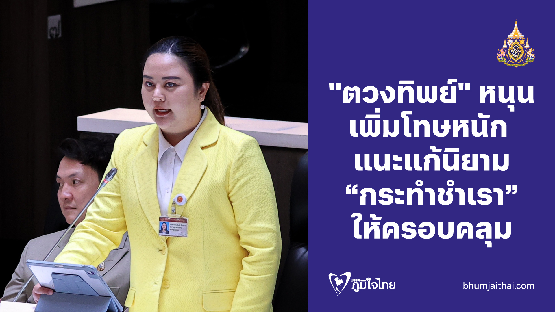 นางสาวตวงทิพย์ จินตะเวช สมาชิกสภาผู้แทนราษฎรจังหวัดอุบลราชธานี พรรคภูมิใจไทย อภิปรายสนับสนุนร่างพระราชบัญญัติแก้ไขเพิ่มเติมประมวลกฎหมายอาญาว่า เนื่องจากในปัจจุบันนี้การกระทําความผิดทางเพศมีหลายรูปแบบเป็นการกระทําต่อบุคคลทุกเพศ ทุกวัย ซึ่งเป็นการกระทําที่ก่อให้เกิดความเสียหายทั้งต่อร่างกายและจิตใจของผู้ถูกกระทํา สร้างรอยแผลเป็นตราบาปไปตลอดชีวิต ดังนั้นจึงเห็นสมควรแก้ไขเพิ่มเติมบทนิยามของคําว่า "กระทําชําเรา" เพื่อให้ครอบคลุมการกระทําความผิดในพฤติการณ์ต่างๆ ให้มีความหลากหลาย เพิ่มบทลงโทษให้หนักขึ้น เนื่องจากปัจจุบันนี้ปัญหาการคุกคามทางเพศ ล่วงละเมิดทางเพศเพิ่มขึ้นอย่างรวดเร็ว และทวีความรุนแรงมากยิ่งขึ้น เพราะในปัจจุบันกฎหมายมีบทลงโทษเพียงเล็กน้อย ทําให้ผู้กระทําความผิดไม่เกรงกลัว จึงควรปรับให้เหมาะสมกับสถานการณ์ที่ทุกวันนี้สังคมเปลี่ยนแปลงไปอย่างรวดเร็วทั้งด้านเทคโนโลยีที่ทันสมัย แต่ก็เปรียบเสมือนดาบสองคมที่มีการเข้าถึงเรื่องทางเพศได้ง่ายดาย อาจทําให้เกิดพฤติกรรมเลียนแบบ เกิดความรุนแรงในครอบครัวซึ่งเห็นจากข่าวแทบทุกวัน ทั้งการทําร้ายร่างกายของสามีภรรยา พ่อเลี้ยงข่มขืนลูกเลี้ยง บางกรณีหนักถึงขั้นเสียชีวิต และที่หนักกว่านั้นคือมีการกระทําความผิดซ้ำแล้วซ้ำอีกโดยไม่เกรงกลัวกฎหมาย