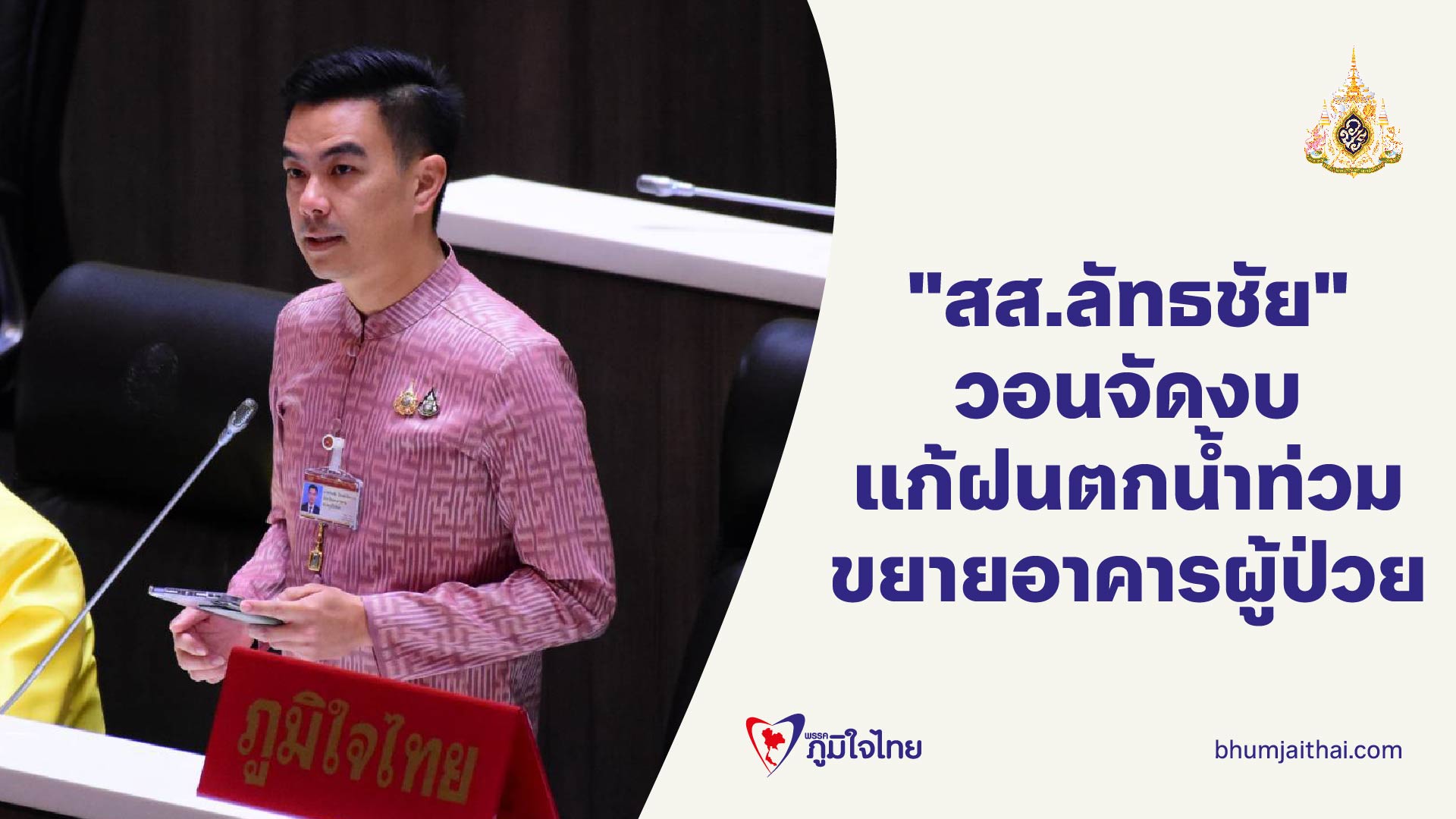 "สส.ลัทธชัย" หารือสภาฯ จัดงบแก้ปัญหาฝนตกหนักน้ำระบายไม่ทัน ทำชาวบ้านเดือดร้อน และขอใช้พื้นที่สถานีตำรวจ ซึ่งเป็นพื้นที่ราชพัสดุ สร้างอาคารผู้ป่วยใน