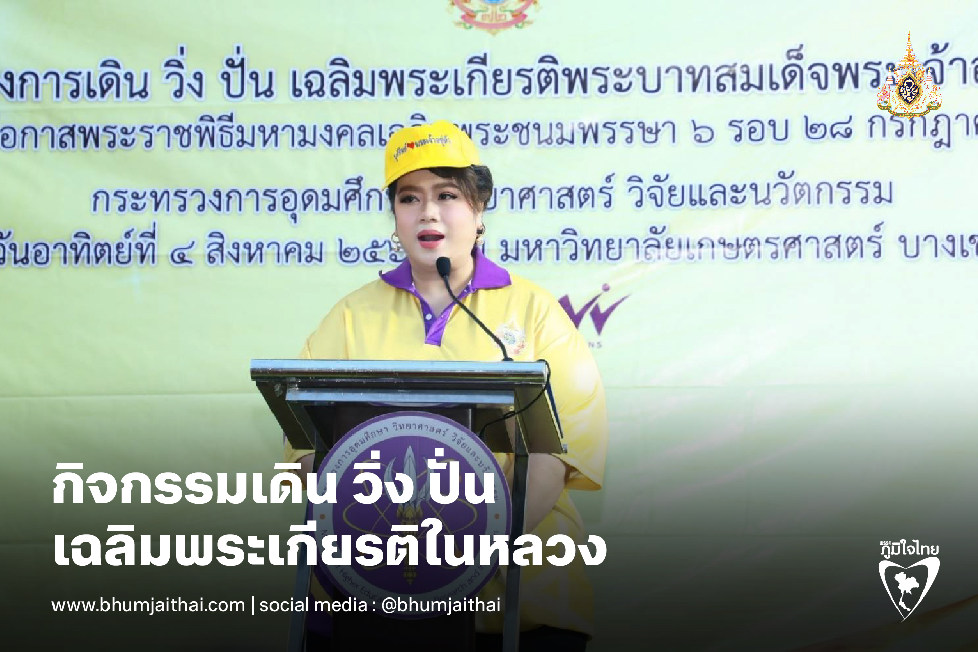 รมว.อว. กล่าวต่อว่า โครงการดังกล่าวจัดขึ้นเพื่อแสดงถึงความจงรักภักดี รวมถึงให้ข้าราชการ เจ้าหน้าที่ นิสิตนักศึกษา และประชาชนทุกเพศ ทุกวัย ทั้งในส่วนกลางและส่วนภูมิภาค ได้มีโอกาสออกกำลังกายเพื่อสร้างเสริมสุขภาพ แสดงออกถึงความจงรักภักดี และน้อมสำนึกในพระมหากรุณาธิคุณ เพื่อถวายเป็นพระราชกุศล สืบสานพระราชปณิธานของพระบาทสมเด็จพระเจ้าอยู่หัว โดยใช้พื้นที่ของสถานศึกษาและหน่วยงานราชการให้เกิดประโยชน์ต่อชุมชน