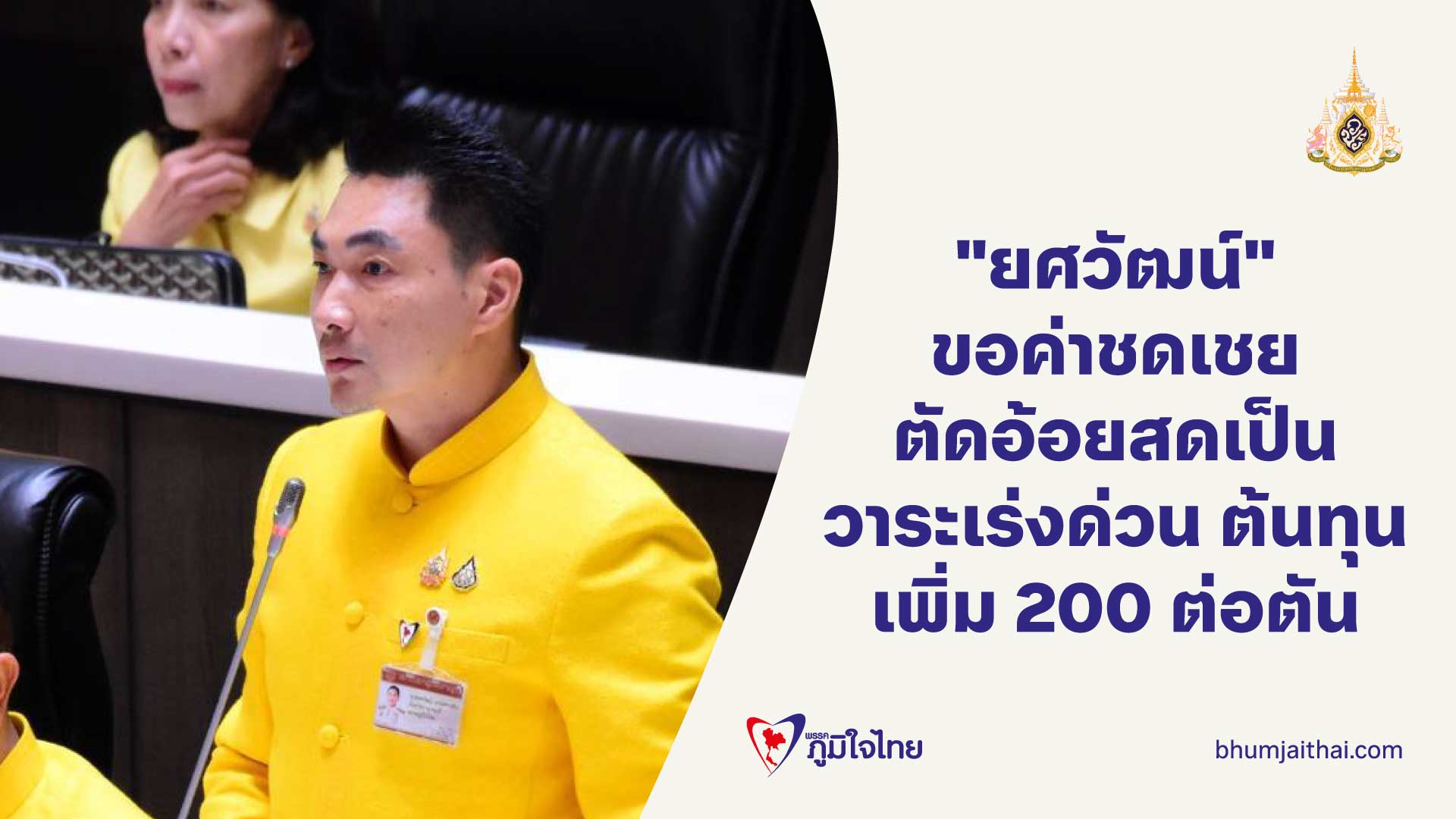 นายยศวัฒน์ กล่าวอีกว่า ในปีที่ผ่านมา เกษตรกรฝากมาพูดในสภาและขอบคุณรัฐบาลที่ได้ให้เงินชดเชยจากการตัดอ้อยสด โดยผ่านมติครม.เป็นจํานวน 120 บาทต่อตัน แต่ในปีนี้ 2566/67 ที่ผ่านมา เกษตรกรไม่ได้รับเงินชดเชยที่เกษตรกรให้ความสําคัญกับนโยบายของภาครัฐ ถามว่าทําไมถึงเป็นอย่างนั้น ต้องฝากไปยังคณะกรรมการอ้อยและน้ำตาล รวมถึงคณะรัฐมนตรีได้โปรดพิจารณาเป็นวาระเร่งด่วน เพราะเป็นผลกระทบโดยตรงต่อเกษตรกร เพราะปัจจุบันราคาขายอ้อยอยู่ที่ 1300 ถึง 1400 บาทต่อตัน ต้นทุนการผลิตของเกษตรกรอยู่ที่ 1200 ถ้าไปตัดอ้อยสดก็จะมีต้นทุนที่สูงขึ้นอีก 200 รวมต้นทุนเป็น 1400 บาทต่อตัน เกษตรกรลงทุนคาดหวังเฝ้ารอบผลผลิตหนึ่งปีจะได้เงินมาดูแลครอบครัว แต่ปรากฏว่าลงทุนไปราคาขายเท่ากับราคาต้นทุน มิหนำซ้ำหน่วยงานรัฐบาลพยามผลักดันให้ตัดอ้อยสดเพื่อลดปัญหาพีเอ็ม 2.5 เพระการตัดอ้อยไฟไหม้ทำให้เกิด ปัญหาสิ่งแวดล้อม แต่สิ่งที่เกษตรกรได้รับคือต้องแบกภาระต้นทุนของการตัดอ้อยสดเพิ่มขึ้น แต่ราคาขายเท่าเดิมแต่ต้นทุนสูงขึ้น หน่วยงานรัฐ และรัฐบาลเคยให้การสนับสนุนเกษตรกรคือให้เงินช่วยเหลือ 120 บาทต่อตัน แต่ปัจจุบันไม่มีเงินชดเชยในส่วนนี้ให้กับเกษตรกรแล้ว จะต้องไปดูในส่วนของงบประมาณที่สำนักงานคณะกรรมการอ้อยและน้ำตาลได้รับว่างบประมาณที่ใช้ในแต่ละปีประมาณ 300 ล้านบาท คุ้มค่าหรือไม่ เกษตรกรได้รับประโยชน์จริงหรือไม่ แม้ว่าเงินชดเชยในส่วนนี้จะไม่ใช่เงินงบประมาณที่สำนักงานคณะการอ้อยและน้ำตาลได้รับ